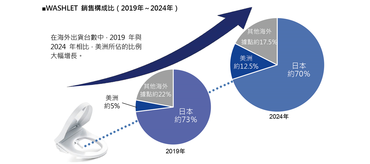 WASHLET 的海外銷售始於 1980 年代後期的美國。在追求各國生活文化與設計偏好的同時,產品已於超過 100 個國家發售;繼中國之後,美洲、亞洲及大洋洲、歐洲等地對於 WASHLET 的需求亦持續增加。在累計出貨量達成 5000 萬台的 2019 年,海外銷售佔比約為 27%,而至最近的 2024 年,海外佔比已超過 30%。其中,近 5 年成長率最高的美洲市場,自進入該市場以來,為擴大通路而設置 WASHLET 體驗場所,持續進行扎實的認知推廣活動。目前已進入普及期,在社群媒體發展與入境遊客增加的助力下,加上疫情後清潔意識急速提升,銷售大幅成長。今後除了進一步完善主力的建材店(Kitchen & Bath Shop)通路、電子商務及大型零售店等購買管道外,也將致力於提升保養維修等服務品質。