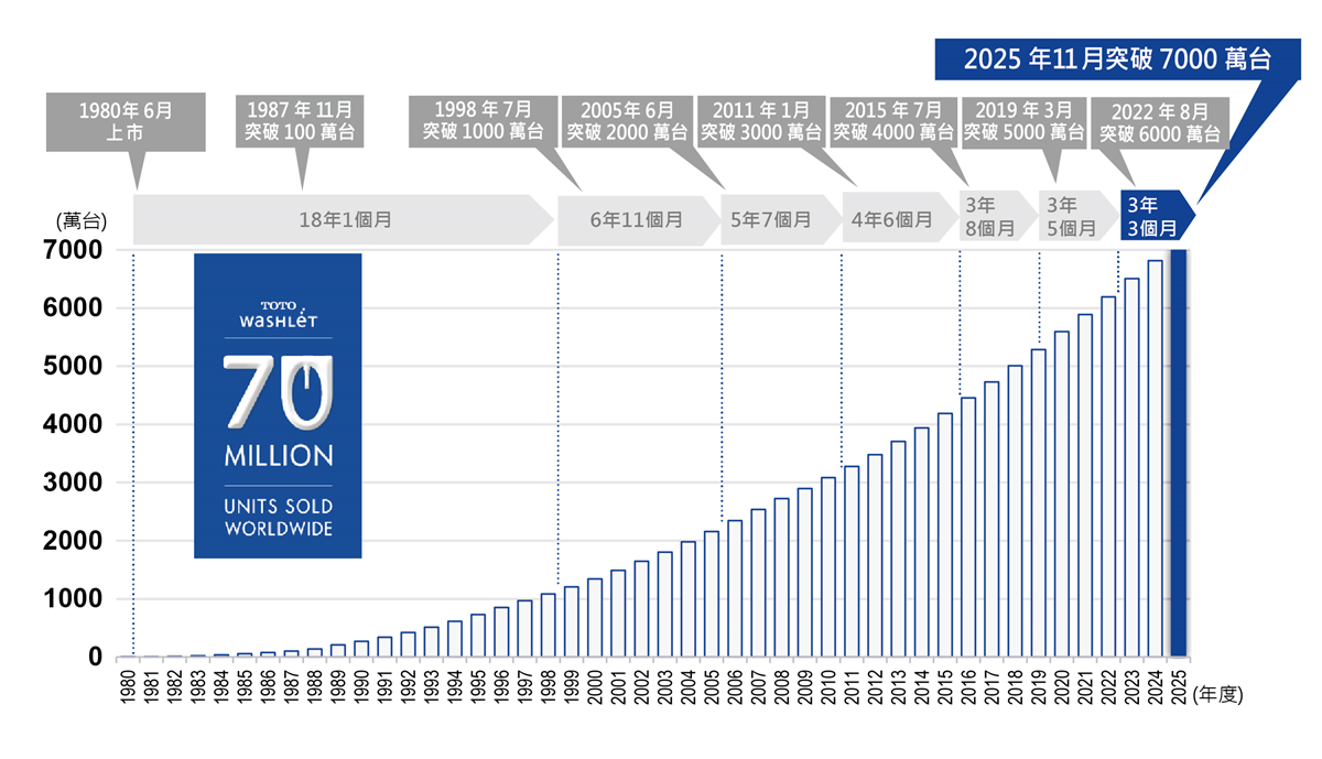 TOTO 株式會社(總部:福岡縣北九州市,社長:田村 信也)宣布,旗下的溫水洗淨便座「WASHLET(※1)」在 2025 年 11 月達成了全球累計出貨台數 7,000 萬台的里程碑(含便座式、WASHLET 一體形馬桶;統計範圍包含日本國內及海外市場)。自 1980 年 6 月第一代產品發售以來,歷經 45 年 5 個月,WASHLET 已廣泛應用於住宅及公共設施(※2)等各種場域。此外,在美洲、歐洲及亞洲等海外市場,TOTO 持續推動深耕當地的在地化提案,使得需求進一步擴大,銷售業績亦顯著攀升。