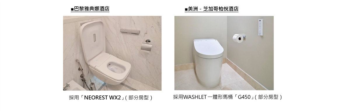 - 秉持著「為全球顧客提供舒適、清潔的如廁空間」之願景,TOTO 海外據點致力於創造能親身體驗 WASHLET 的場域。除了銷售據點外,亦積極推動產品導入眾多顧客造訪的知名地標,特別是飯店等住宿設施。相關導入案例亦可於 TOTO Global 網站※3瀏覽。※3:TOTO全球官網內的「Global Reference」頁面中,介紹了從過往至今的最新導入案例。 https://www.toto.com/project/