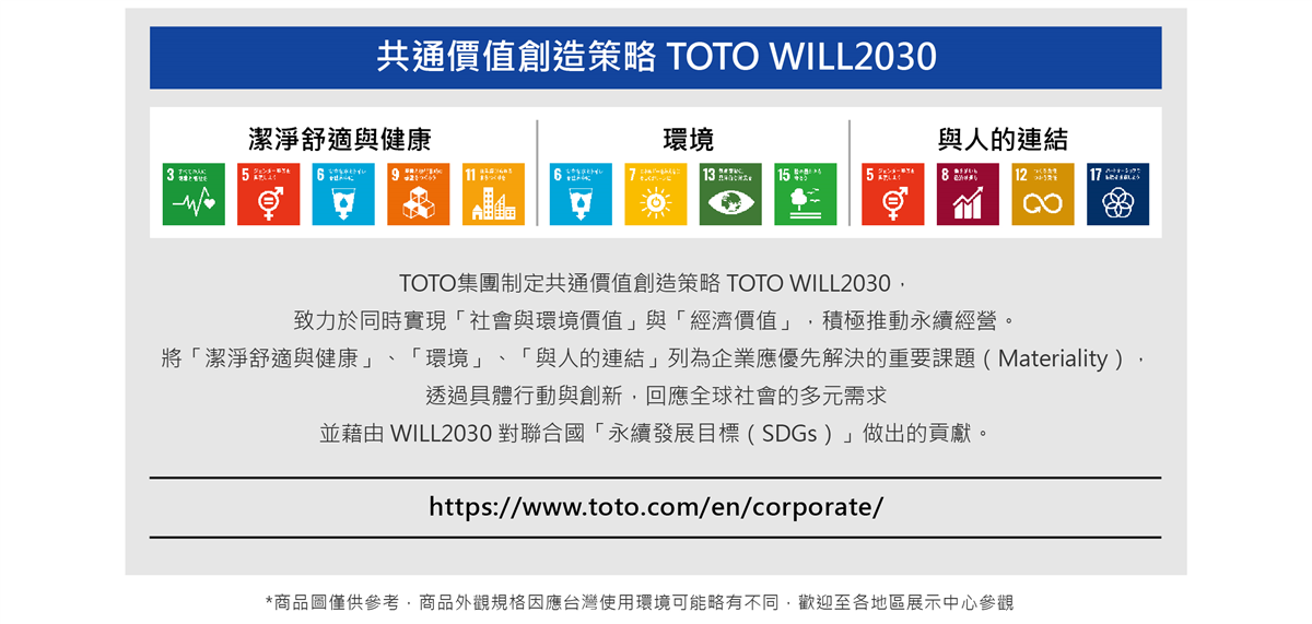 依循「新共享價值創造策略 TOTO WILL 2030」的目標,TOTO 力求在全球推廣兼顧潔淨、舒適與環保的產品,為實現一個環保、繁榮且舒適的社會做出貢獻。
